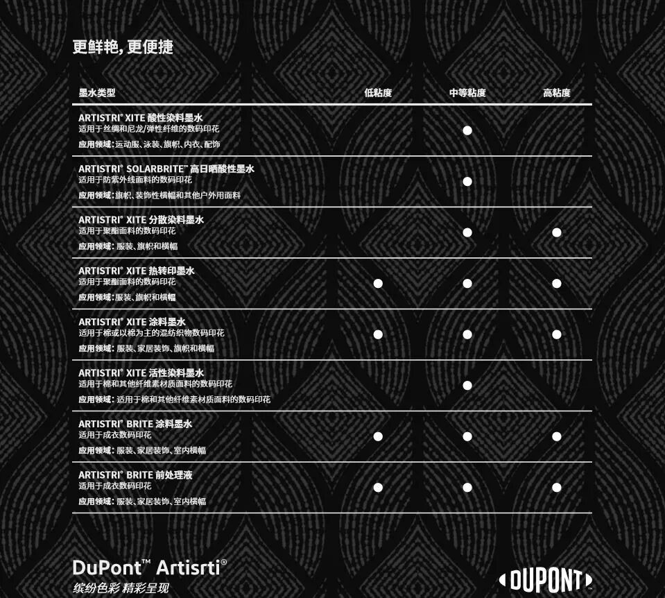而每一个点每一步的优化,都涉及墨水的很多学问,杜邦在墨水方面整个体系的完整性优势就得以发挥。在国内,可能我们会了解到杜邦在涂料和高温分散领域很突出,其实在全球市场,杜邦在热转印、活性、酸性等的应用也都非常多。我们在不同领域都在做更进一步的研究,在推动数码印花的发展中,杜邦其实做了很多努力,未来还将不断突破行业难题。”